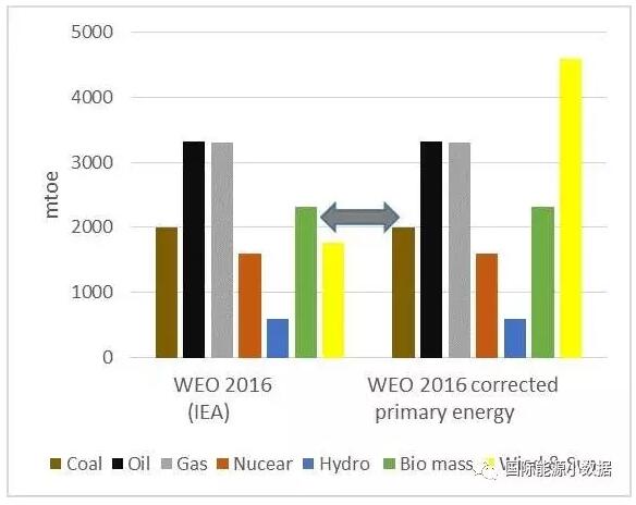 如果修正IEA的計(jì)量錯(cuò)誤的話,那么IEA對(duì)2040年450ppm情境分析下一次能源結(jié)構(gòu)的預(yù)測(cè)中,光伏與風(fēng)電貢獻(xiàn)應(yīng)乘以系數(shù)2.9,那樣風(fēng)電光伏合計(jì)在2040年應(yīng)是最大的一次能源。