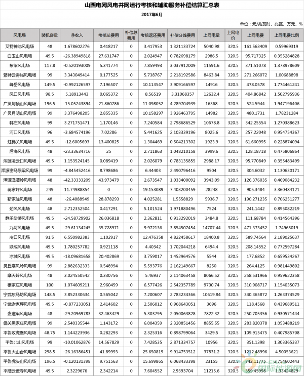 近日,山西能監(jiān)辦公布了2017年6月份風電考核結果,通過表格可以看出,截至6月份,山西風電項目裝機容量總計達到7829 3兆瓦,風電上網電量總計8 4億千瓦時,具體情況如下表所示: