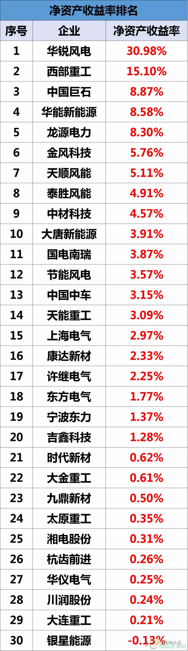 這些風(fēng)電企業(yè)中近一半的營收為負增長,但凈利潤卻只有兩家企業(yè)為負;值得一提的是已經(jīng)ST得華銳風(fēng)電扭虧為盈,以4.34億元的凈利潤排在利潤榜的第8位!不僅如此,華銳風(fēng)電在30加企業(yè)中擁有最高的凈資產(chǎn)收益率。