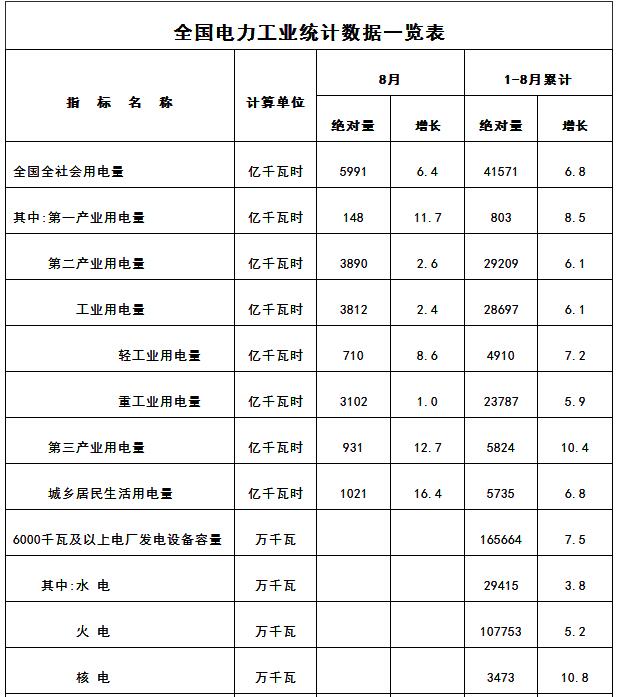國(guó)家能源局發(fā)布1-8月份全國(guó)電力工業(yè)統(tǒng)計(jì)數(shù)據(jù)