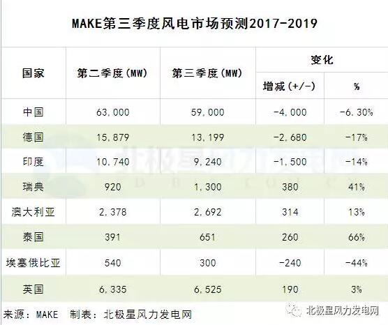 MAKE根據(jù)全球風(fēng)電市場(chǎng)最新變化,對(duì)市場(chǎng)預(yù)測(cè)進(jìn)行了微調(diào)。據(jù)最新預(yù)測(cè),中國(guó)風(fēng)電2017-2019年新增裝機(jī)為59GW,下調(diào)6.3%。