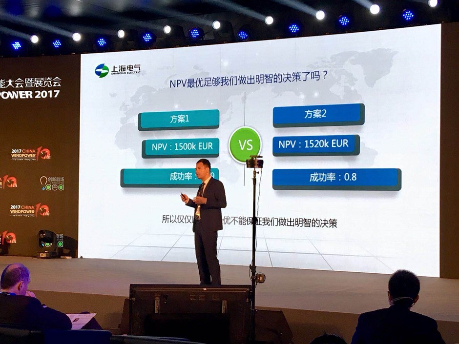 實際上在風(fēng)機開發(fā)過程中我們知道是面臨很多風(fēng)險的問題,所以包含了很多風(fēng)險決策的問題,這個是講的很籠統(tǒng)的,所以用這個方法可以應(yīng)用到各種風(fēng)險決策的上面,比如說我們開發(fā)一個新的風(fēng)機,我們可能有兩個選項,用以前小的風(fēng)機進行擴容,也可以重新完全開發(fā)一個新型的風(fēng)機,新型的風(fēng)機我相信它的性能更高、產(chǎn)出更高,但是代價和風(fēng)險更大,這個時候如果這樣去做,我們可以科學(xué)的選擇哪一個方案更佳。