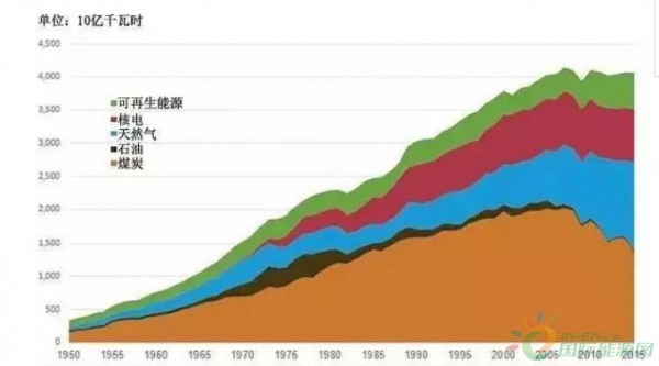(2)2005 年—2015 年十年間,美國的風電份額從幾乎可以忽略,上升到接近5%。同期, 其總用電量2015 年幾乎回到了2005 年的水平(見圖2)。電力需求已經(jīng)飽和,甚至略微下降。這是風光等可再生能源快速在電力結(jié)構(gòu)中擴大份額的機會,而不是障礙。