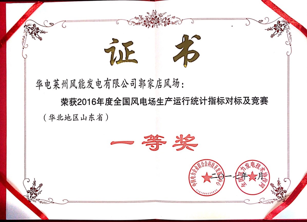 華電萊州郭家店榮獲2016年全國風場評比一等獎