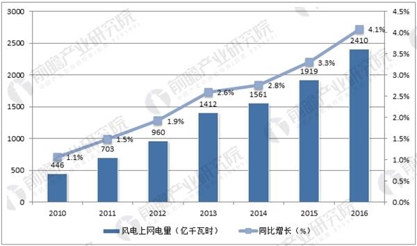 中國風(fēng)電上網(wǎng)電量占總發(fā)電量比例逐年增加,2016年風(fēng)電上網(wǎng)電量為2410億千瓦時,占總發(fā)電量的比重達4.08%, 超越核電(3.56%)和光伏(1.12%)成為我國第一大新能源發(fā)電形式。隨著國家能源局一些列消納措施的落地,風(fēng)電上網(wǎng)電量逐漸攀升,棄風(fēng)限電有望逐步緩解,行業(yè)逐步轉(zhuǎn)向市場化。