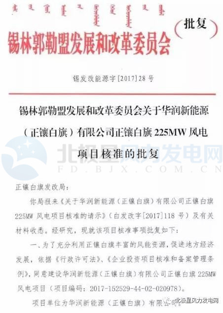 華潤新能源內(nèi)蒙古正鑲白旗225MW風(fēng)電項目獲核準