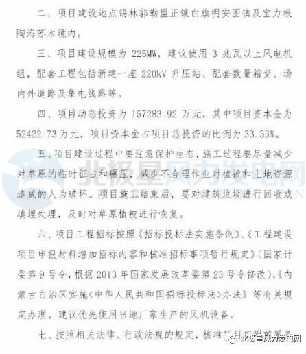 北極星風(fēng)力發(fā)電網(wǎng)獲悉,內(nèi)蒙古錫林郭勒盟發(fā)改委近日核準了華潤新能源正鑲白旗風(fēng)電項目。項目建設(shè)規(guī)模為225MW,建議使用3兆瓦以上風(fēng)電機組。項目動態(tài)投資為157283.92萬元。以下為核準原文: