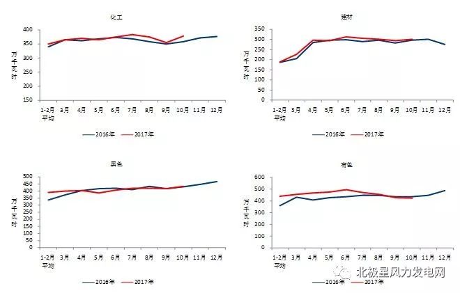 圖4 2016、2017年重點(diǎn)行業(yè)分月用電量情況