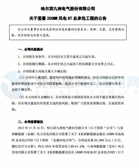 11 月16 日,哈爾濱九洲電氣股份有限公司與亞洲新能源(金湖)風(fēng)力發(fā)電有限公司簽署了關(guān)于《亞洲新能源金湖縣 100MW 風(fēng)電場(chǎng) BT 總承包合同》,合同總價(jià)款 85,000 萬(wàn)元;與亞洲新能源(寶應(yīng))風(fēng)力發(fā)電有限