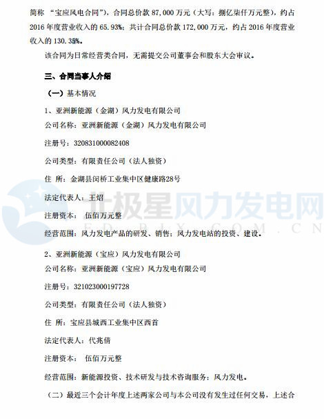 11 月16 日,哈爾濱九洲電氣股份有限公司與亞洲新能源(金湖)風(fēng)力發(fā)電有限公司簽署了關(guān)于《亞洲新能源金湖縣 100MW 風(fēng)電場(chǎng) BT 總承包合同》,合同總價(jià)款 85,000 萬(wàn)元;與亞洲新能源(寶應(yīng))風(fēng)力發(fā)電有限公司簽署了關(guān)于《亞洲新能源寶應(yīng)縣 100MW 風(fēng)電場(chǎng) BT 總承包合同》,合同總價(jià)款 87,000 萬(wàn)元,約占 2016 年度營(yíng)業(yè)收入的 65.93%;共計(jì)合同總價(jià)款 172,000 萬(wàn)元,約占 2016 年度營(yíng)業(yè)收入的 130.35%。