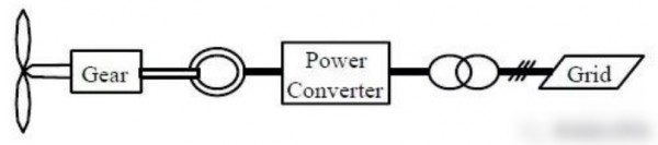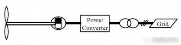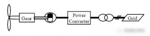 類(lèi)型C:葉輪主軸直接與發(fā)電機(jī)轉(zhuǎn)子連接、無(wú)齒輪箱,發(fā)電機(jī)采用永磁同步發(fā)電機(jī)、多極對(duì)轉(zhuǎn)子,并網(wǎng)側(cè)設(shè)全功率變頻整流逆變裝置。