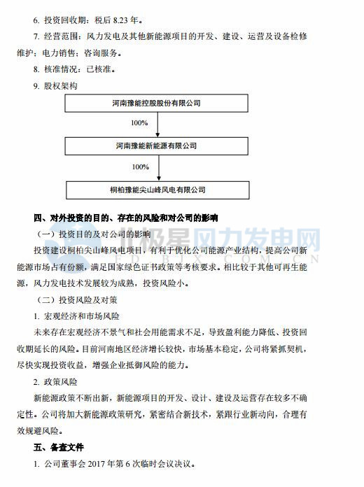 河南豫能控股股份有限公司12 月 26 日召開董事會 2017 年第 6 次臨時 會議,審議通過了《關(guān)于投資建設(shè)桐柏尖山峰風(fēng)電項目的議案》,決定出資設(shè)立桐柏豫能尖山峰風(fēng)電有限公司,持股比例 100%,投資建設(shè)桐柏尖山峰風(fēng)電項目,該項目裝機規(guī)模50MW,注冊資本5000 萬元,項目總投資 達到3.72 億元。以下是會議原文: