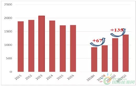 2017年上半年國內(nèi)新增并網(wǎng)容量9.7GW,其中紅六省80萬千瓦,同比下降67萬千瓦;其余省份8.88GW,同比回升64萬千瓦。2017年前三季度,內(nèi)蒙古、黑龍江三省新增并網(wǎng)容量80萬千瓦,同比2016年前三季度少并網(wǎng)67萬千瓦。由于六省要求2017年不新建風電場,并考慮到2016年第4季度六省新增并網(wǎng)容量3.34GW,全年新并網(wǎng)容量4.81GW,相當于2017年六省新增并網(wǎng)容量將比2016年少將近4GW??紤]到2017年并網(wǎng)項目中約2GW為去年完成吊裝,預(yù)測2017年全國風電新增裝機較去年少4GW,約19.3GW左右。