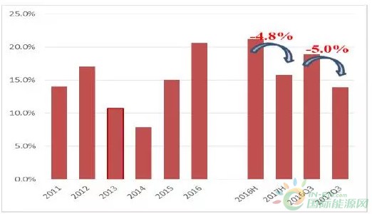 從棄風率指標上看,上半年全國平均棄風率15.8%,同比降低4.8個百分點;前三季度棄風率13.9%,同比降低5個百分點。2017年棄風限電情況逐季好轉(zhuǎn)。六省中,甘肅棄風率由2016年43%逐季度下降到2017年前三季度的33%,新疆棄風率由2016年38%逐季度下降到2017年前三季度的29%,這兩個省份棄風率最為嚴重,目前改善非常顯著、但仍然高于20%;黑龍江、吉林、內(nèi)蒙古、寧夏四省份棄風率已經(jīng)顯著低于20%。寧夏將率先解決棄風問題。
