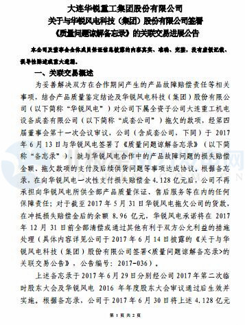 大連重工于 2017 年 6 月 13 日與華銳風電簽署了《質(zhì)量問題諒解備忘錄》,就與華銳風電合作中的產(chǎn)品故障問題的損失賠償金額、拖欠款