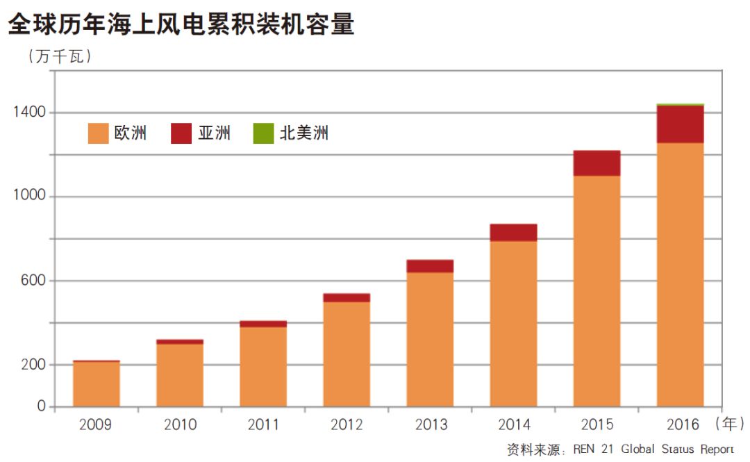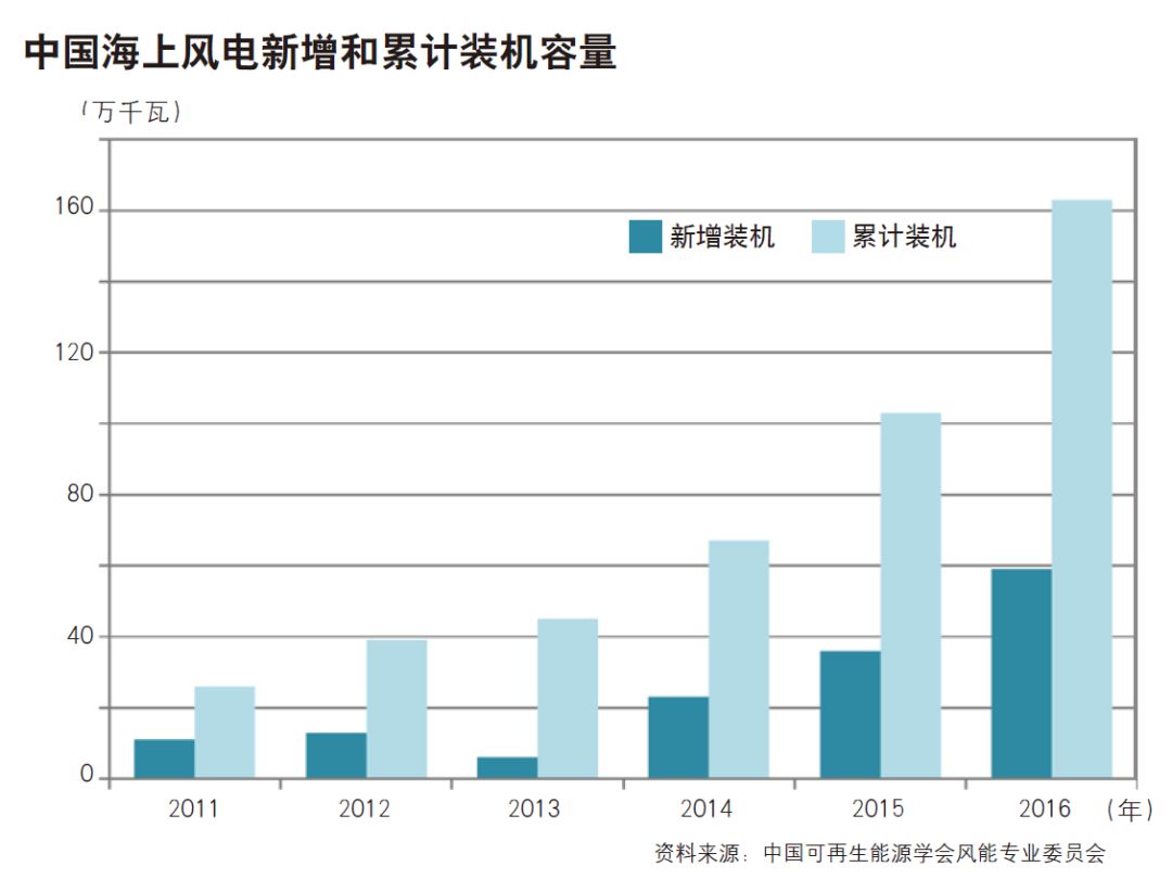 截至2016年底,我國已建成海上風電累計裝機容量162萬千瓦,在全球僅次于英國與德國。我國海上風電占全國風電總裝機容量的比重由2011年的0.42%上升至2016年的0.96%。