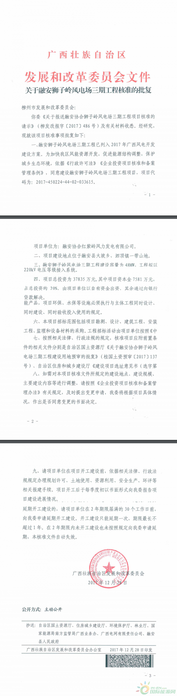 1月10日,國際能源網(wǎng)從廣西壯族自治區(qū)發(fā)展和改革委員會獲悉,廣西壯族自治區(qū)發(fā)展和改革委員會關(guān)于融安獅子嶺風(fēng)電場三期工程核準(zhǔn)的批復(fù)?!?