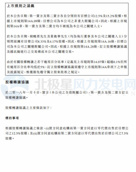 2018年1月10日,北控清潔能源全資附屬公司與第一及第二賣方訂立股權(quán)轉(zhuǎn)讓協(xié)議,同意收購(gòu)第一賣方同意出售的北控風(fēng)力發(fā)電有限公司12 5%股權(quán);