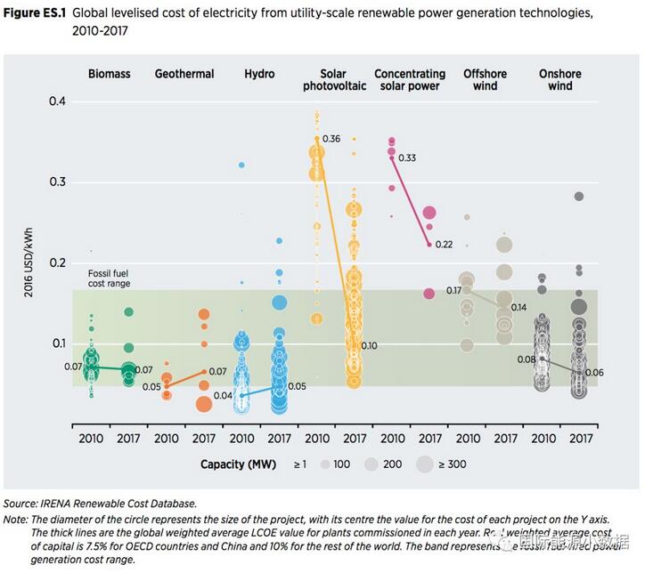 可再生能源署(IRENA)發(fā)布《可再生能源發(fā)電成本報(bào)告》,披露全球范圍內(nèi)2017年投運(yùn)的生物質(zhì)發(fā)電、地?zé)岚l(fā)電、水電、陸上風(fēng)電、海上風(fēng)電、光