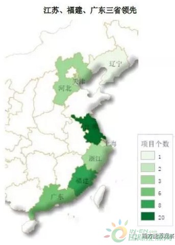 目前,國內(nèi)海上風(fēng)電的開發(fā)主要還集中在江蘇、福建、廣東三省,其中前者開發(fā)成本較低,后兩者風(fēng)資源更優(yōu)。僅從擁有項(xiàng)目個(gè)數(shù)上來看,江蘇省最多,已建設(shè)、在建、核準(zhǔn)待建項(xiàng)目共計(jì)20個(gè),福建省、廣東省緊隨其后,分別為8個(gè)和6個(gè)。
