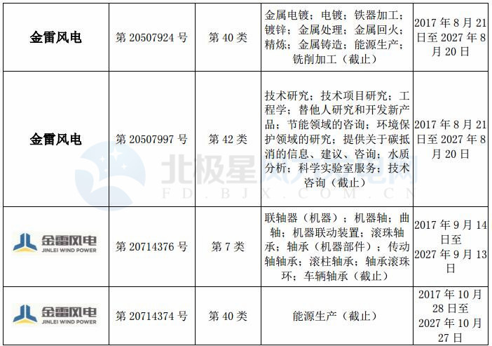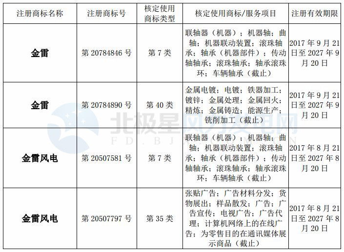 金雷風(fēng)電方面稱,以上商標(biāo)的取得,不會對公司生產(chǎn)經(jīng)營產(chǎn)生重大影響,但有利于其加強(qiáng)對注冊商標(biāo)的保護(hù),防止有關(guān)商標(biāo)侵權(quán)事件的發(fā)生,有利于提升核心競爭力。