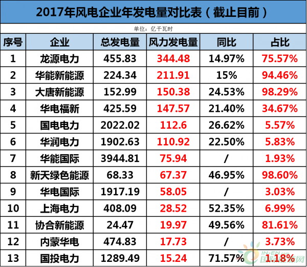 根據(jù)國家統(tǒng)計局數(shù)據(jù),2017年全國風力絕對發(fā)電量達到了2695億千瓦時。通過下表我們一起來看下這些企業(yè)的風力發(fā)電量在全國的占比: