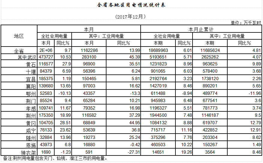 今日,湖北省發(fā)改委公布2017年全省電力運(yùn)行情況:截止年底,全省全口徑裝機(jī)容量7124.48萬千瓦,同比增長5.62%;其中,風(fēng)電252.83萬千瓦,占3.55%。全年發(fā)電量2645.58億千瓦時(shí),增長6.10%;全年發(fā)電計(jì)劃完成率100.73%,其中,風(fēng)電98.41%。全社會(huì)用電量1869.00億千瓦時(shí),增長6.01%。以下為具體數(shù)據(jù):
