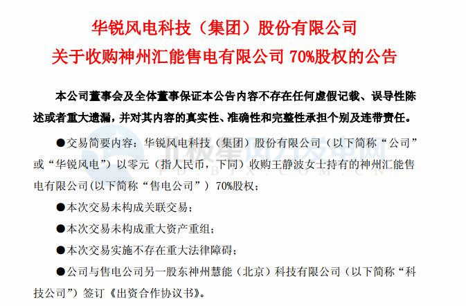 增加新的利潤(rùn)增長(zhǎng)點(diǎn)!華銳風(fēng)電零元收購(gòu)神州匯能售電有限公司