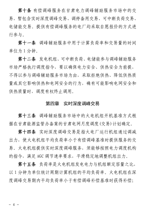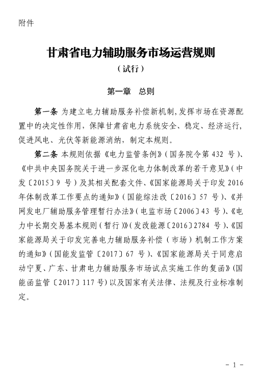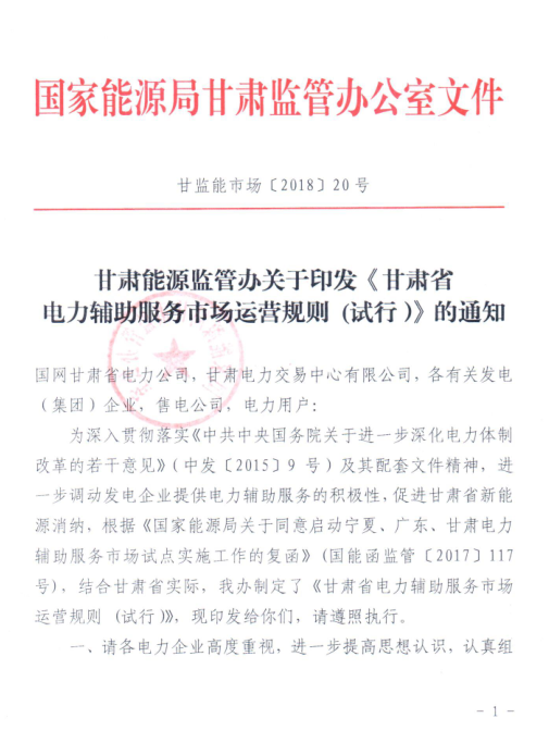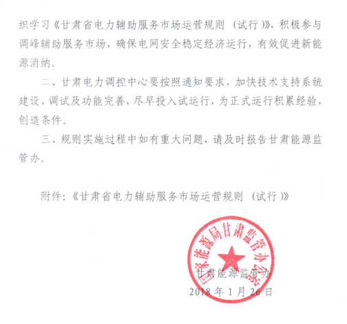國(guó)家能源局甘肅監(jiān)管辦日前發(fā)布了《甘肅省電力輔助服務(wù)市場(chǎng)運(yùn)營(yíng)規(guī)則(試行)》,于2018年4月1日起執(zhí)行。