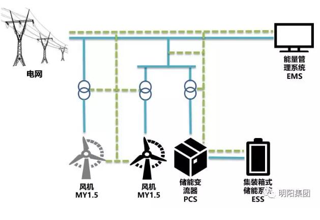 分布式能源系統(tǒng)讓能源生產(chǎn)靠近需求側(cè),根據(jù)不同場景的需求變化平衡能源供給與使用,滿足多重目標(biāo)的中、小型能量轉(zhuǎn)換利用,實(shí)現(xiàn)了更加清潔、智慧、靈活和高效的能量生產(chǎn)和消費(fèi)方式,為我國能源結(jié)構(gòu)的戰(zhàn)略性優(yōu)化和能源供給側(cè)結(jié)構(gòu)改革提供了重要解決途徑。大慶中丹風(fēng)機(jī)儲(chǔ)能智能發(fā)電系統(tǒng)主要由風(fēng)力發(fā)電機(jī)組(MY1.5)、儲(chǔ)能變流器(PCS)、集裝箱式儲(chǔ)能系統(tǒng)ESS、箱式變壓器、配電系統(tǒng)、能量管理系統(tǒng)(EMS)以及電網(wǎng)等單元組成。