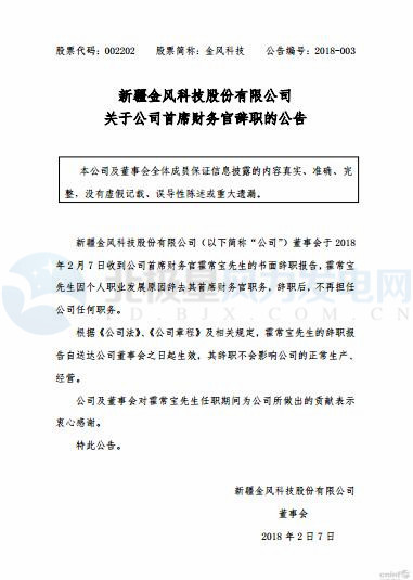 原金風(fēng)科技首席財務(wù)官霍常寶在年前已從金風(fēng)辭職,辭職后,不再擔(dān)任公司任何職務(wù)。從金風(fēng)董事會發(fā)出的公告可以看到,霍常寶遞交辭呈和其辭職