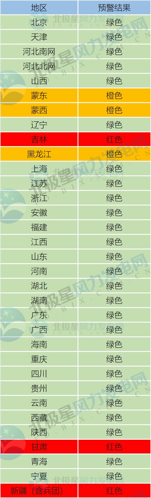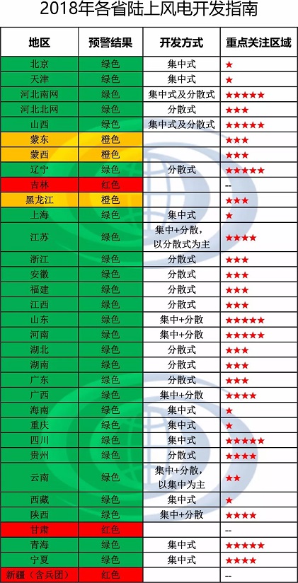 根據(jù)國能發(fā)新能[2018]23號《國家能源局關(guān)于發(fā)布2018年度風(fēng)電投資監(jiān)測預(yù)警結(jié)果的通知》文件顯示,紅色區(qū)域暫停風(fēng)電開發(fā)建設(shè)、橙色區(qū)域需嚴(yán)格加強(qiáng)規(guī)劃管理和制定消納方案、綠色區(qū)域可自行組織風(fēng)電項(xiàng)目建設(shè)。