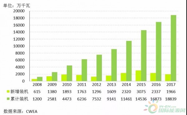 圖1  2008年至2017年中國新增和累計(jì)風(fēng)電裝機(jī)容量
