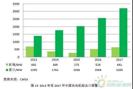 2017年,中國向國外出口風(fēng)電機(jī)組311臺,容量641MW,同比增長21%。截至2017年底,中國風(fēng)電機(jī)組制造企業(yè)已出口的風(fēng)電機(jī)組共計(jì)1707臺,累計(jì)容量達(dá)到3205MW。