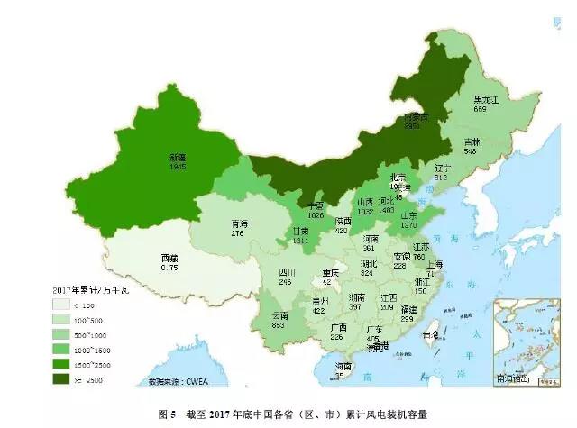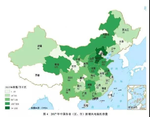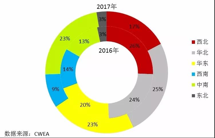2017年,中國六大區(qū)域的風(fēng)電新增裝機(jī)容量所占比例分別為華北(25%)、中南(23%)、華東(23%)、西北(17%)、西南(9%)、東北(3%)。“三北”地區(qū)新增裝機(jī)容量占比為45%,中東南部地區(qū)新增裝機(jī)容量占比達(dá)到55%。