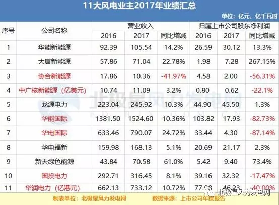 截至發(fā)文日,除去未發(fā)布正式業(yè)績報告的國電電力,北極星此次共整理了2017年11家上市風電開發(fā)商和6家風電整機商的相關(guān)業(yè)績報告。