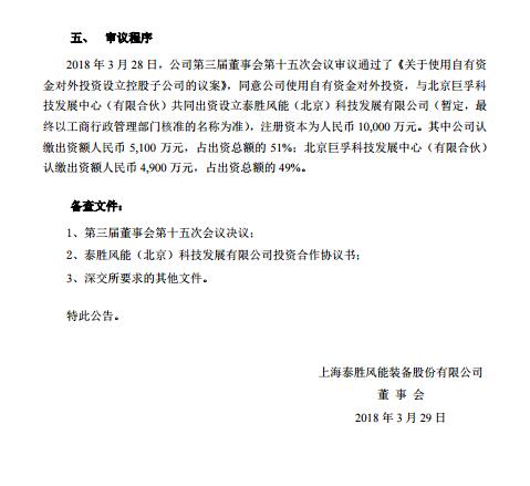 2018 年 3 月 28 日,泰勝風(fēng)能第三屆董事會(huì)第十五次會(huì)議審議通過了《關(guān)于使用自有資金對外投資設(shè)立控股子公司的議案》,決定使用自有資金對外投資,與北京巨孚科技發(fā)展中心(有限合伙)共同出資設(shè)立泰勝風(fēng)能(北京)科技發(fā)展有限公司,注冊資本為1億元( 10,000 萬元);其中泰勝風(fēng)能認(rèn)繳出資額人民幣 5,100 萬元,占出資總額的 51%。