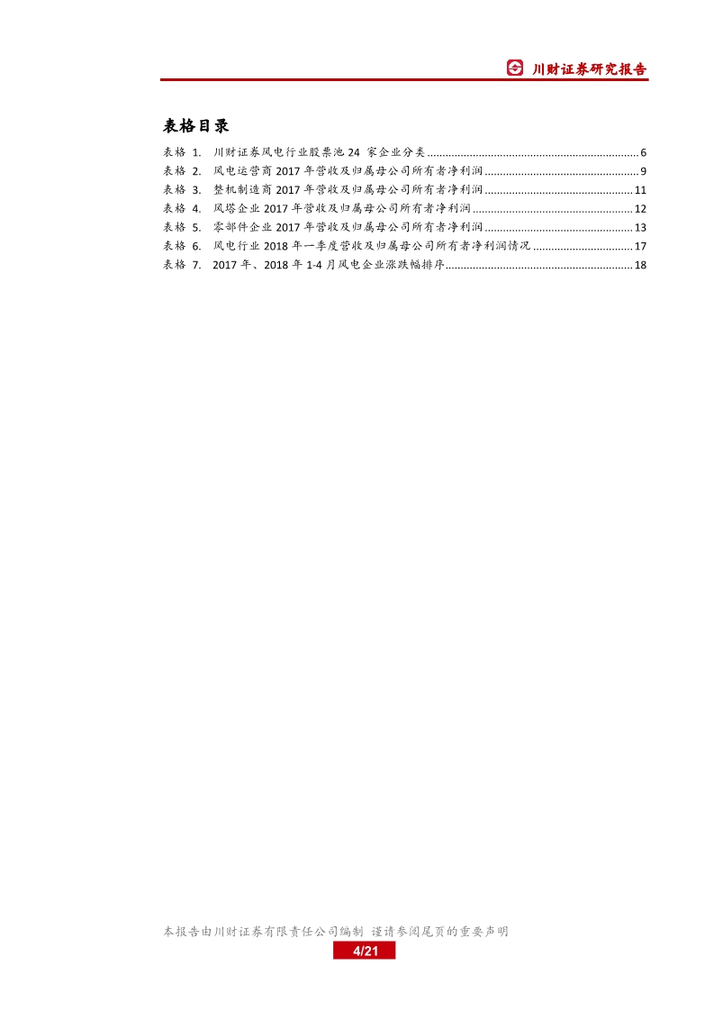 2017 年我國新增并網(wǎng)、吊裝裝機分別同比下滑 22.12%、16.22%,棄風率有所下降,全年風電發(fā)電量 3057 億千瓦時,同比增長 26.85 %,利用小時數(shù)同比增長 206 小時至 1948 小時,有較大程度的改善。受整機招標價格下降與原材料價格持續(xù)上漲的影響,2017 年川財證券風電行業(yè)股票池內(nèi) 24 家公司營業(yè)收入 1248 億元,同比增長 1.34%;歸屬母公司所有者凈利潤 151.76 億元,同比增長 35.63%,其中風電運營商盈利顯著改善。剔除風電運營商,16 家公司收入同比減少 0.82%至 711 億元,歸屬母公司所有者凈利潤同比增長 72.90%至 62 億元。歸屬母公司所有者凈利潤增速遠高于收入同比增速主要是因 ST 銳電歸屬母公司所有者凈利潤與 2016 年相比增長約 32 億元,虧損額大幅減少,剔除 ST 銳電后,15 家整機與零部件企業(yè)收入同比增長 0.31%,凈利潤同比減少 8.66%。?