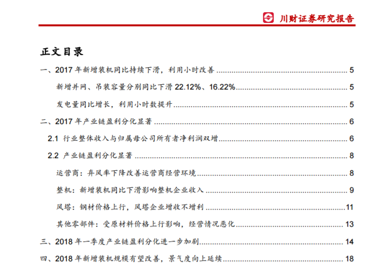 2017 年業(yè)績分化,運營商盈利顯著改善2017 年我國新增并網(wǎng)、吊裝裝機分別同比下滑 22 12%、16 22%,棄風率有所下降,全年風電發(fā)電量 30