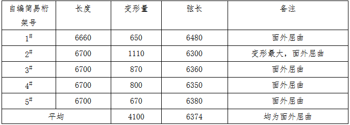 事發(fā)操作平臺的5榀簡易桁架的變形量見表2,其中自編2#簡易桁架的變形量最大,達到1110mm。見圖2。