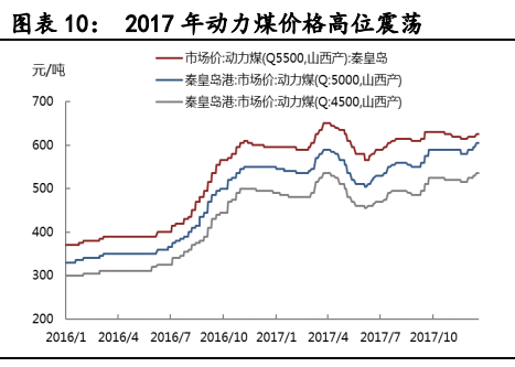 根據(jù)神華集團2016年財報,其自產(chǎn)煤炭的單位生產(chǎn)成本僅為108.9元/噸(圖表9)。而2017年動力煤供需維持緊平衡的狀態(tài)下,全年價格持續(xù)高位震蕩(圖表10),目前秦皇島Q5500動力煤價格處于600元/噸之上。所以,神華集團在單位生產(chǎn)成本之上適當加價后的內(nèi)部銷售價格,也會遠低于當前的市場價格。這也意味著,神華集團和國電集團合并成立國家能源投資集團以后,其發(fā)電成本將大幅降低。