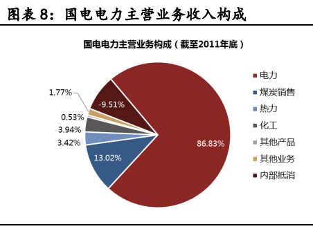 中國國電集團的第一大業(yè)務為發(fā)電和售電。截至2011年底國電集團發(fā)電總裝機容量為1.07億千瓦,大約是神華集團的一倍。其中,燃煤發(fā)電機組總裝機容量為0.83億千瓦,2011年燃煤發(fā)電量估計在3700億千瓦時。但是,國電集團煤炭產(chǎn)量遠低于神華集團。2011年國電集團的煤炭產(chǎn)量為0.65億噸,不到神華集團的四分之一。從中國國電集團旗下全國性電力上市公司—國電電力(600795.SH)的業(yè)務構成來看,其電力生產(chǎn)及銷售業(yè)務的營收占比達到86.8%,煤炭開采和銷售業(yè)務占比為13%(圖表8)。