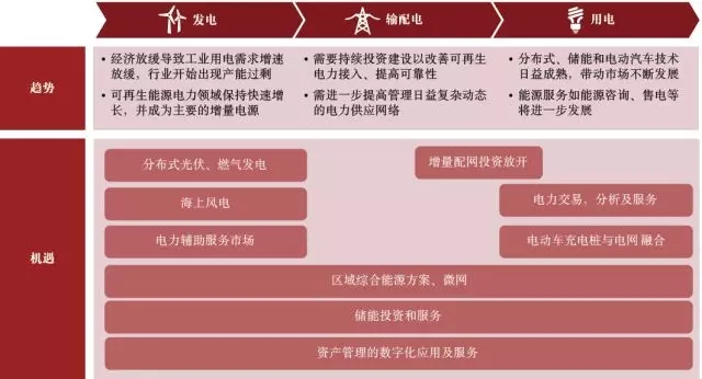 按照“十三五”規(guī)劃目標,風電和光伏發(fā)電裝機容量將在2020年分別達到210吉瓦和110吉瓦,年平均增速分別為9.9%和21.2%。其中由于靠近用戶側,分布式能源將快速發(fā)展。包括天然氣、太陽能等分布式能源系統(tǒng)的運營和管理將會是未來電力市場的主要發(fā)展機遇之一。隨著儲能成本的下降,儲能技術從發(fā)電到用電的應用場景也陸續(xù)開始出現(xiàn)。其中發(fā)電機組調頻輔助服務、用電側電費管理等領域開始出現(xiàn)商業(yè)化案例。電動汽車的發(fā)展帶來了大量的充電樁建設、運營以及與電網(wǎng)融合的需求。售電市場在短時間內降低電廠利潤的同時也為電廠打開了通往工商業(yè)用戶的大門,使上萬電力用戶參與市場交易。此外,數(shù)字化技術的發(fā)展為電力集團控制成本、提高市場效率和競爭力提供了技術手段。