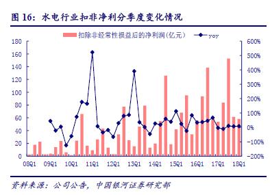 水電扣非凈利持續(xù)增長(zhǎng),凈利率同比下滑。2017 年水電行業(yè)實(shí)現(xiàn)扣非凈利354.7 億元,同比提升2.5%;2018 年一季度58.2 億元,同比增加8.3%,環(huán)比減少5.3%。2017 年水電凈利率29.0%,同比降低2.8 個(gè)百分點(diǎn);2018 年一季度22.8%,較去年同期下降0.2 個(gè)百分點(diǎn),環(huán)比去年四季度提高6.1 個(gè)百分點(diǎn)。