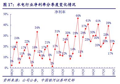 水電收益率水平較正常。2017 年水電行業(yè)凈資產(chǎn)收益率為13.4%,同比降低0.5 個(gè)百分點(diǎn)。2018 年一季度水電行業(yè)凈資產(chǎn)收益率2.1%,與去年同期持平,環(huán)比2017 年四季度下降0.2 個(gè)百分點(diǎn)。