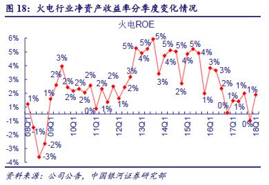 自2016 年四季度,火電凈資產(chǎn)收益率維持歷史較低水平。2017 年火電行業(yè)凈資產(chǎn)收益率為2.9%,同比降低5.4 個(gè)百分點(diǎn)。2018 年一季度火電行業(yè)凈資產(chǎn)收益率1.4%,同比、環(huán)比分別提升0.4 個(gè)、1.9 個(gè)百分點(diǎn)。