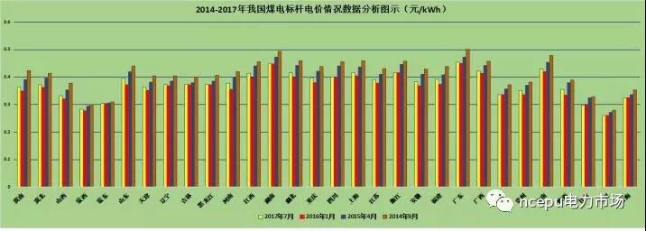 2014到2017年之間,我國各省的煤電標(biāo)桿電價的對比情況主要如下圖所示。