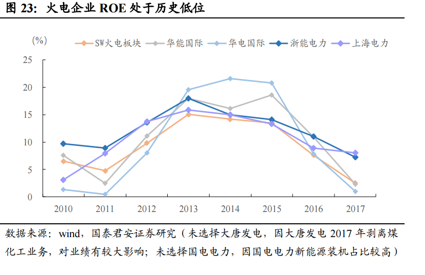 標桿上網(wǎng)電價下調(diào)的概率較小。目前來看國家大力推行降電價的措施主要針對電網(wǎng)端及附加費用等,2017 年 4 月 1 日取消城市公用事業(yè)附加費,7 月 1 日取消工業(yè)結(jié)構(gòu)調(diào)整基金,下調(diào)國家重大水利工程建設(shè)基金和大中型水庫移民后期扶持基金,通過降低附加費用的方式讓利于下游,并未涉及下調(diào)上網(wǎng)電價。同時在煤價高位運行的背景下,火電企業(yè)不具備承受電價下調(diào)的基礎(chǔ),2017 年底四大集團向發(fā)改委遞交《關(guān)于當前電煤保供形勢嚴峻的緊急報告》,報告中提到 2017 年高煤價導致五大發(fā)電集團煤電板塊虧損 402 億元,虧損面高達 60%。從火電上市公司 2017 年的業(yè)績來看,ROE 也紛紛跌進歷史低點。因此我們認為上網(wǎng)端電價的下調(diào)空間非常有限,預(yù)計在煤價回歸合理區(qū)間之前,上網(wǎng)端標桿電價下調(diào)的概率較小。