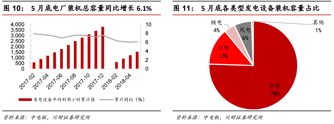 電力裝機(jī)方面:截止 2018 年 5 月底,全國(guó) 6,000 千瓦及以上電廠裝機(jī)容量 17.2 億千瓦,同比增長(zhǎng) 6.1%,增速比上年同期回落 1.3 個(gè)百分點(diǎn)。其中,水電裝機(jī)容量 3.0 億千瓦,同比增長(zhǎng) 2.7%,增速較上年同期下降 1.5 個(gè)百分點(diǎn);火電裝機(jī)容量 11.0 億千瓦,同比增長(zhǎng) 3.7%,增速較上年同期下降 1.1 個(gè)百分點(diǎn);核電裝機(jī)容量 3694 萬(wàn)千瓦,同比增長(zhǎng) 6.4%,增速較上年同期下降 15.5 個(gè)百分點(diǎn);風(fēng)電裝機(jī)容量 1.7 億千瓦,同比增長(zhǎng) 11%,增速較上年同期下降 1.2 個(gè)百分點(diǎn)。