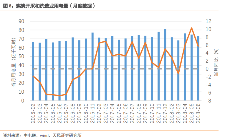 6.4. 煤炭開采與洗選業(yè) 1-6 月份,煤炭開采與洗選業(yè)用電量 444.9 億千瓦時(shí),同比增加 6.33%;6 月份,煤炭開采 與洗選業(yè)用電量 73.0 億千瓦時(shí),同比增加 5.74%。